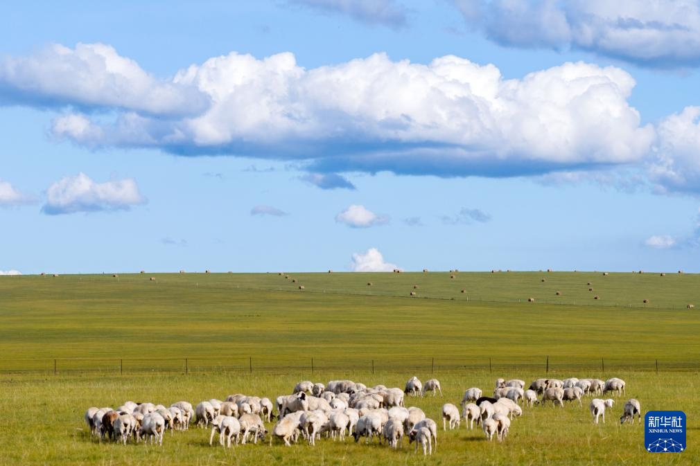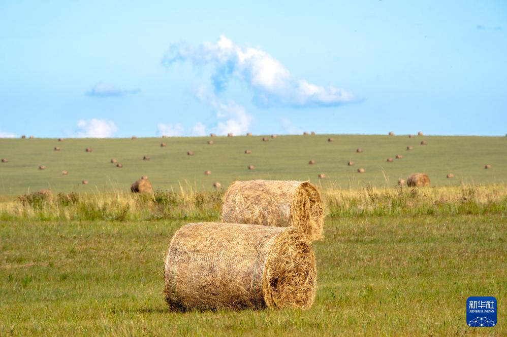 初秋時節,內蒙古呼倫貝爾大草原草色漸黃。在遼闊的草原上,牧民將豐收的牧草捆扎成卷,成群的牛羊、馬匹漫步其間,勾勒出一幅祥和美麗的秋日豐收圖景。